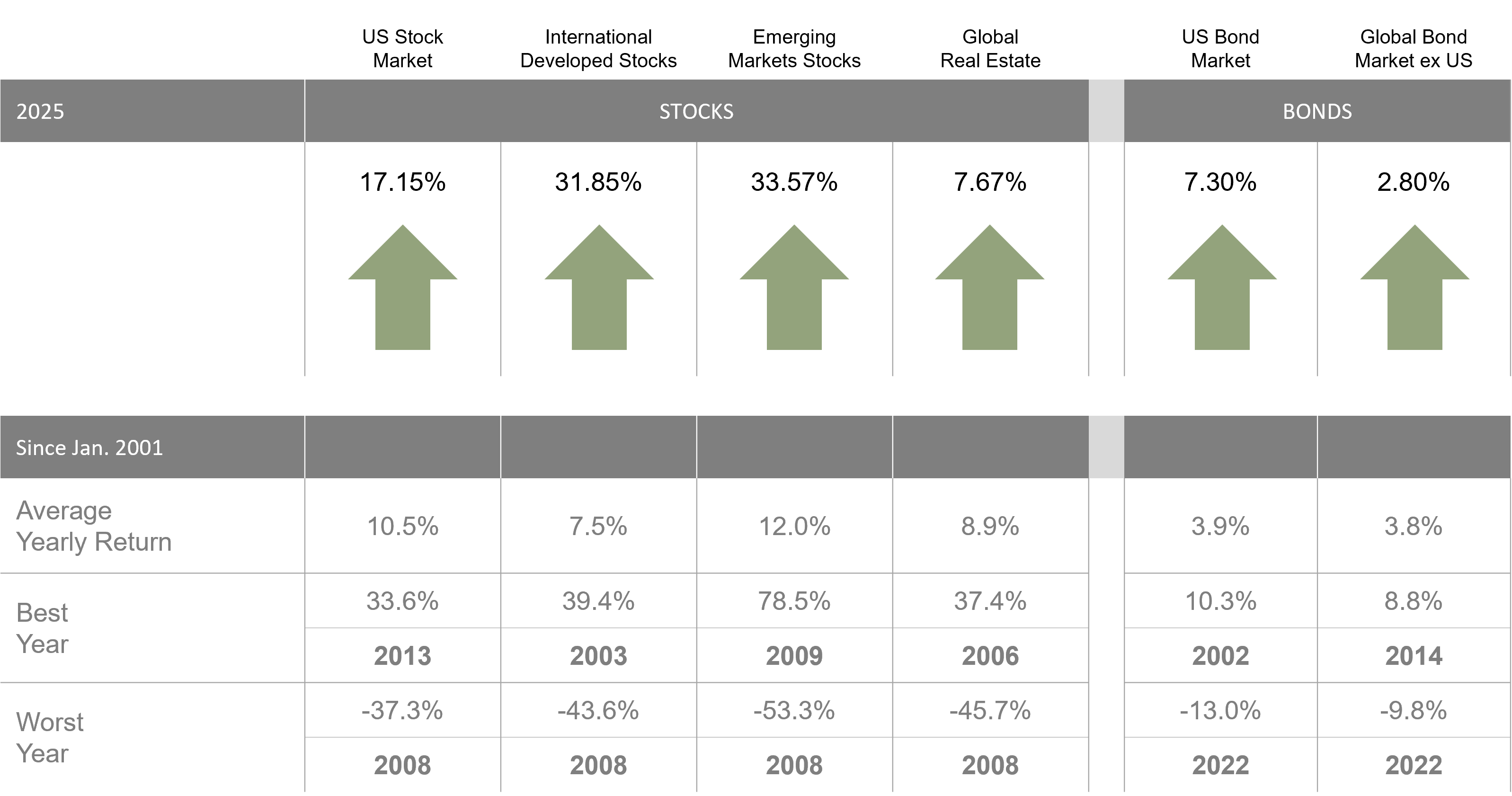 Past performance is not a guarantee of future results. Indices are not available for direct investment. Index performance does not reflect the expenses associated with the management of an actual portfolio. Market segment (index representation) as follows: US Stock Market (Russell 3000 Index), International Developed Stocks (MSCI World ex USA Index [net div.]), Emerging Markets (MSCI Emerging Markets Index [net div.]), Global Real Estate (S&P Global REIT Index [net div.]), US Bond Market (Bloomberg US Aggregate Bond Index), and Global Bond Market ex US (Bloomberg Global Aggregate ex-USD Bond Index [hedged to USD]). S&P data © 2026 S&P Dow Jones Indices LLC, a division of S&P Global. All rights reserved. Frank Russell Company is the source and owner of the trademarks, service marks, and copyrights related to the Russell Indexes. MSCI data © MSCI 2026, all rights reserved. Bloomberg data provided by Bloomberg.