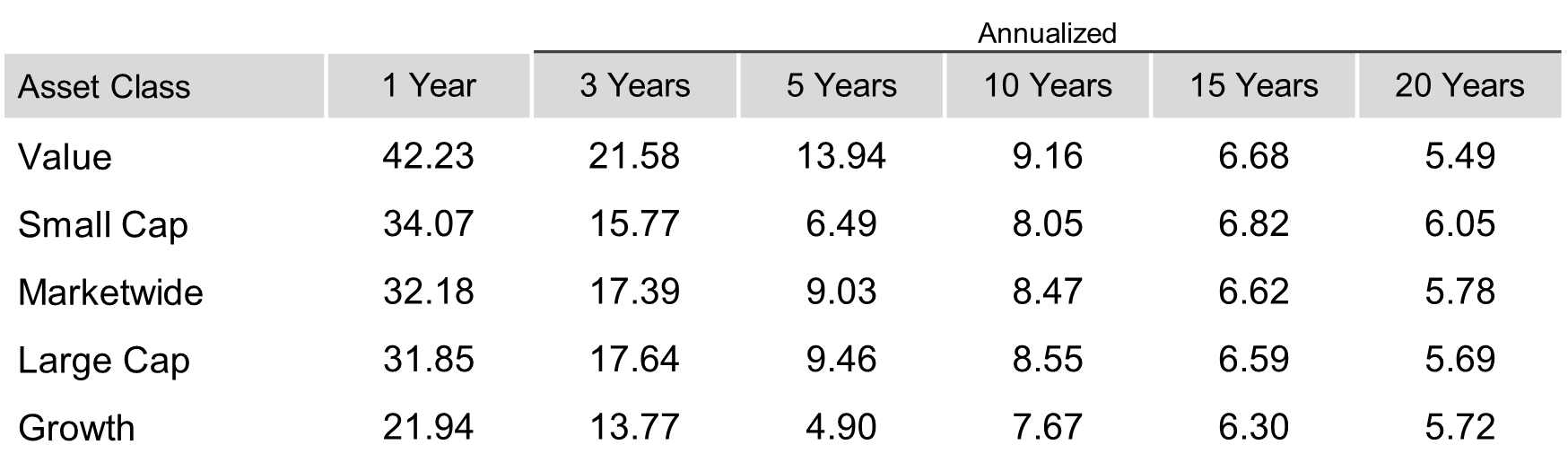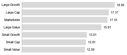 Past performance is not a guarantee of future results. Indices are not available for direct investment. Index performance does not reflect the expenses associated with the management of an actual portfolio. Market segment (index representation) as follows: Marketwide (Russell 3000 Index), Large Cap (Russell 1000 Index), Large Value (Russell 1000 Value Index), Large Growth (Russell 1000 Growth Index), Small Cap (Russell 2000 Index), Small Value (Russell 2000 Value Index), and Small Growth (Russell 2000 Growth Index). World Market Cap represented by Russell 3000 Index, MSCI World ex USA IMI Index, and MSCI Emerging Markets IMI Index. Russell 3000 Index is used as the proxy for the US market. Dow Jones US Select REIT Index used as proxy for the US REIT market. Frank Russell Company is the source and owner of the trademarks, service marks, and copyrights related to the Russell Indexes. MSCI data © MSCI 2026, all rights reserved.