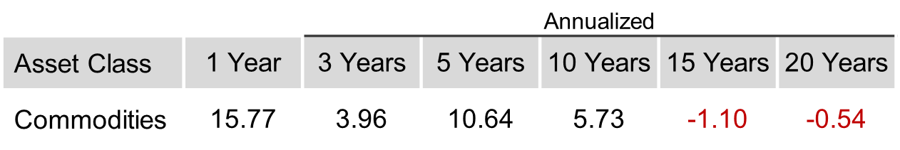 Past performance is not a guarantee of future results. Index is not available for direct investment. Index performance does not reflect the expenses associated with the management of an actual portfolio. Commodities returns represent the return of the Bloomberg Commodity Total Return Index. Individual commodities are sub-index values of the Bloomberg Commodity Total Return Index. Data provided by Bloomberg.