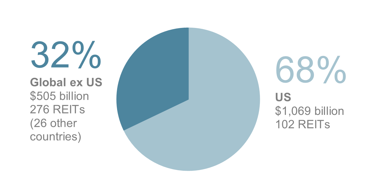 Past performance is not a guarantee of future results. Indices are not available for direct investment. Index performance does not reflect the expenses associated with the management of an actual portfolio. Number of REIT stocks and total value based on the two indices. All index returns are net of withholding tax on dividends. Total value of REIT stocks represented by Dow Jones US Select REIT Index and the S&P Global ex US REIT Index. Dow Jones US Select REIT Index used as proxy for the US market, and S&P Global ex US REIT Index used as proxy for the World ex US market. Dow Jones and S&P data © 2026 S&P Dow Jones Indices LLC, a division of S&P Global. All rights reserved.