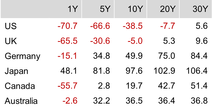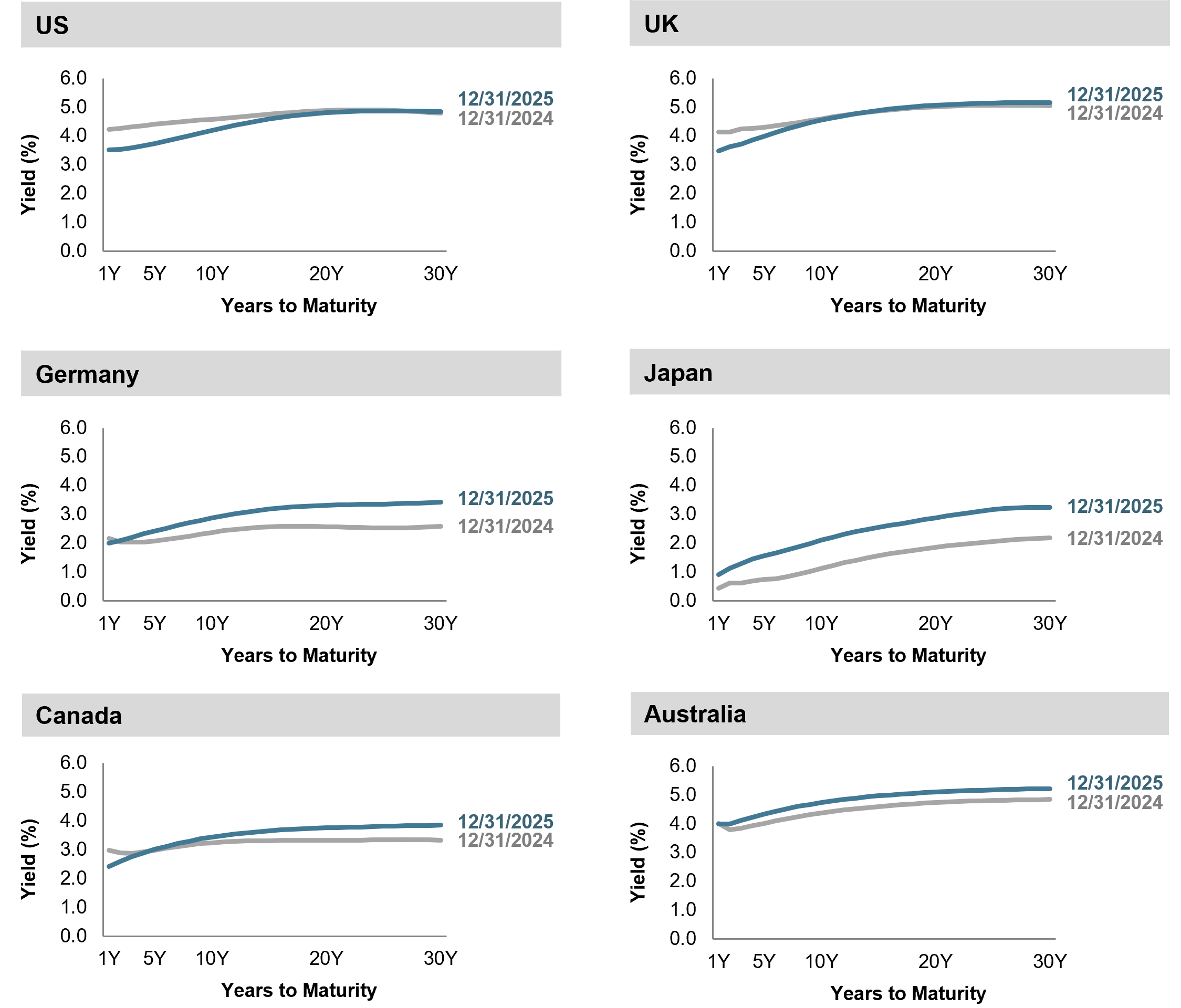 In the US, interest rates generally decreased. In the UK, short- to intermediate-term interest rates decreased, and long-term interest rates increased. In Canada, Germany, UK and Australia, the short-term maturity range of their yield curves was generally flat but steepened in the three- to five-year maturity range.