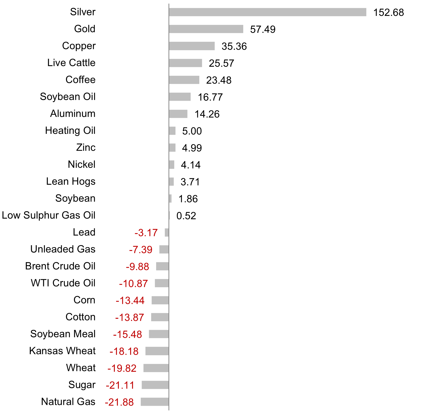 Natural Gas and Sugar were the worst performers, returning -21.88% and -21.11% for the year, respectively.