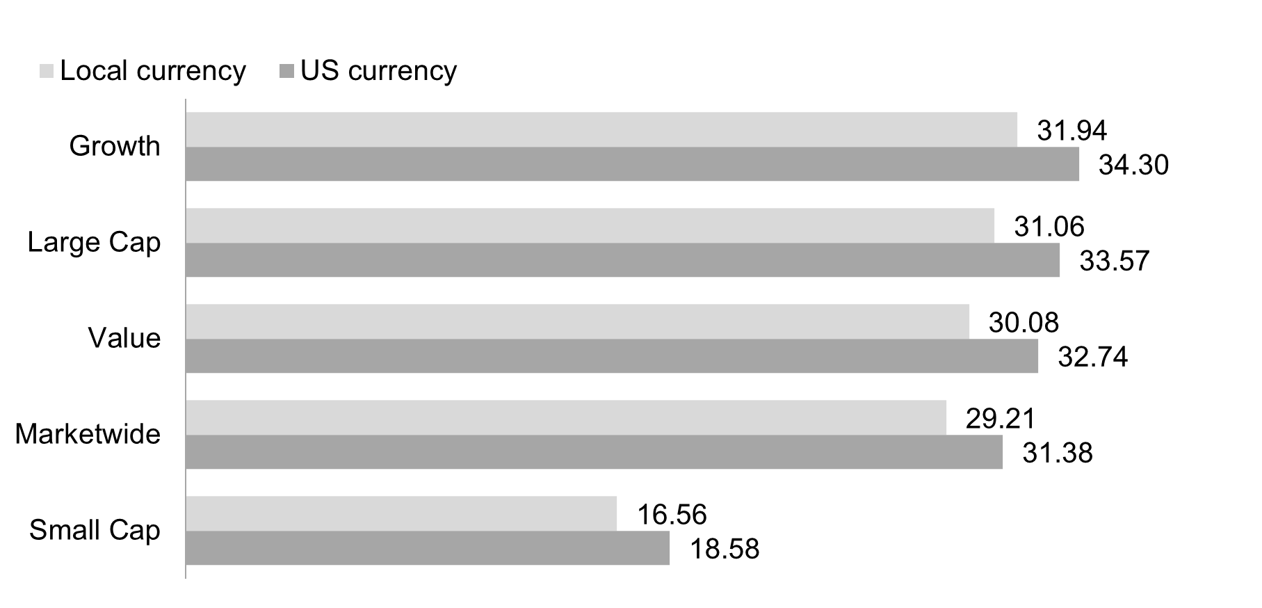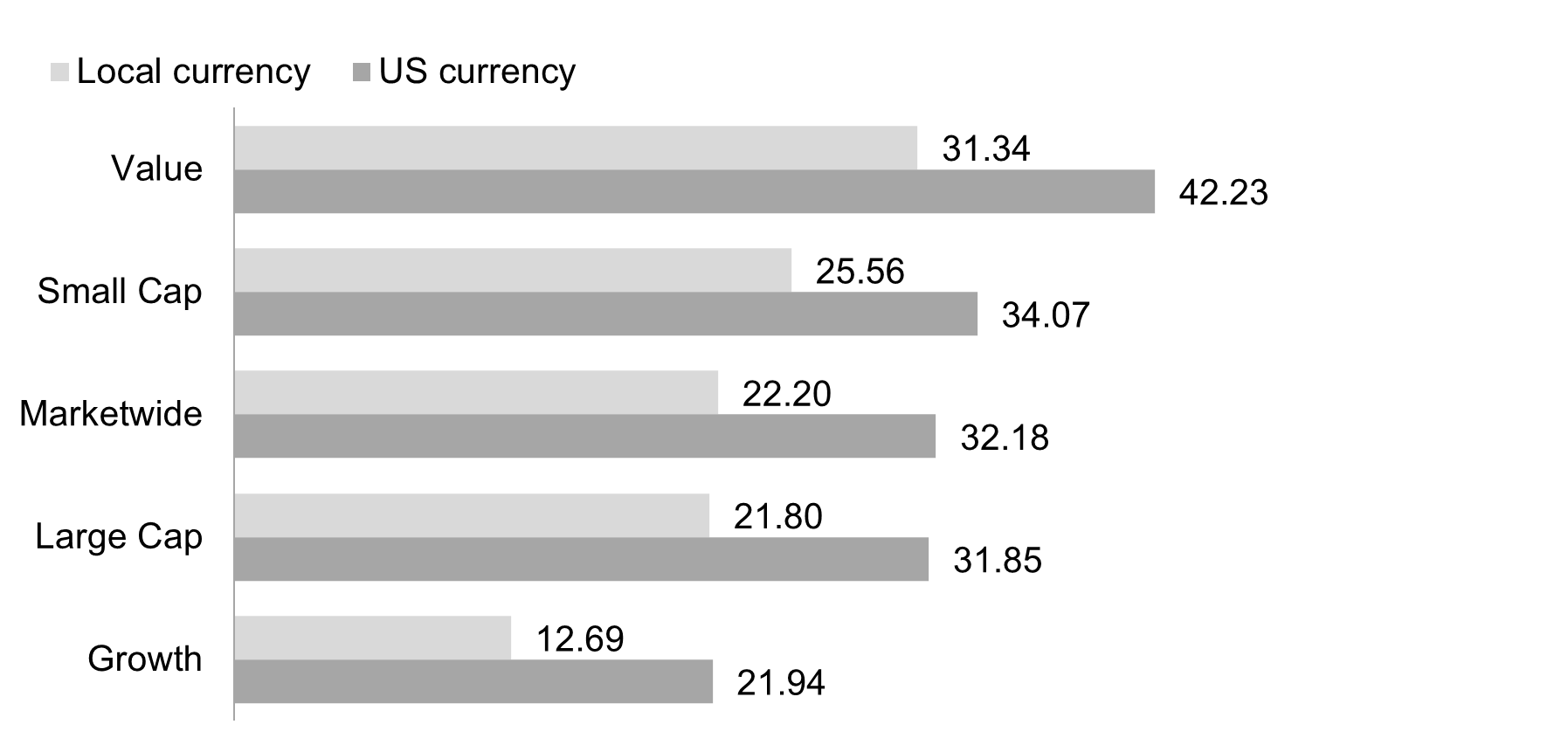 Developed markets outside the US posted positive returns for the year and outperformed US markets, but underperformed emerging markets. The MSCI World ex USA Index returned 31.85%.