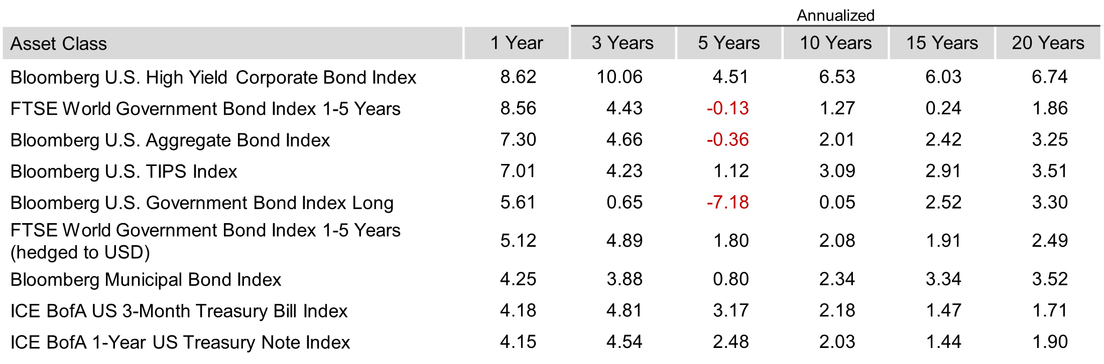 In terms of total returns, short-term US treasury bonds returned +5.84% while intermediate-term US treasury bonds returned +6.51%. Short-term corporate bonds returned +6.81% and intermediate-term corporate bonds returned +7.95%.6
