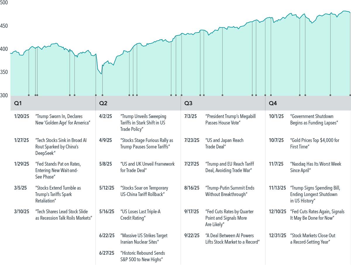 US stocks notched their third year in a row of double-digit gains, but it wasn’t the smoothest ride. The S&P 500 hit records in the winter that were followed by a spring swoon. After powering past that to new highs in the fall, the markets cooled a bit along with the temperatures.3 Still, the S&P 500 was up 17.9% for the year and closed near record levels.4 The climb came despite tariff uncertainty, interest rate changes, and concerns about the durability of AI’s gains—not to mention the longest government shutdown in US history.5