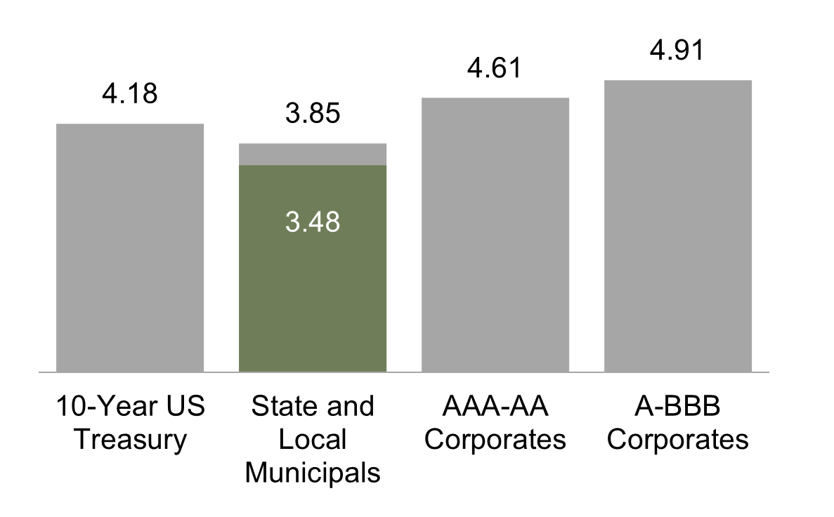One basis point (bps) equals 0.01%. Past performance is not a guarantee of future results. Indices are not available for direct investment. Index performance does not reflect the expenses associated with the management of an actual portfolio. Yield curve data from Federal Reserve. State and local bonds, and the Yield to Worst are from the S&P National AMT-Free Municipal Bond Index. AAA-AA Corporates represent the ICE BofA US Corporates, AA-AAA rated. A-BBB Corporates represent the ICE BofA Corporates, BBB-A rated. Bloomberg data provided by Bloomberg. US long-term bonds, bills, inflation, and fixed income factor data © Stocks, Bonds, Bills, and Inflation (SBBI) Yearbook™, Ibbotson Associates, Chicago (annually updated work by Roger G. Ibbotson and Rex A. Sinquefield). FTSE fixed income indices © 2026 FTSE Fixed Income LLC, all rights reserved. ICE BofA index data © 2026 ICE Data Indices, LLC. S&P data © 2026 S&P Dow Jones Indices LLC, a division of S&P Global. All rights reserved.