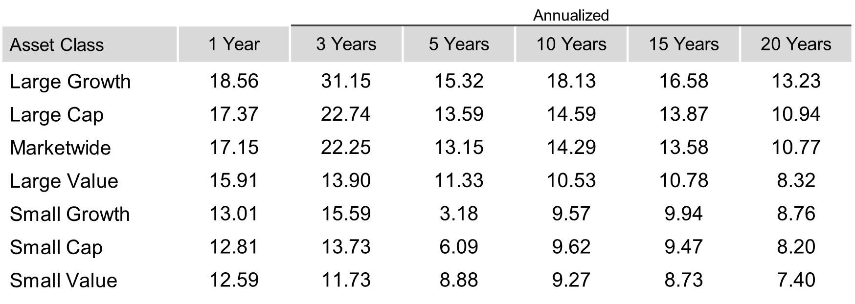 US stocks posted their third consecutive year of double-digit gains. International and emerging markets did even better. Bonds rewarded patience after several difficult years, all serving to remind investors that waiting is often part of achieving available returns.
