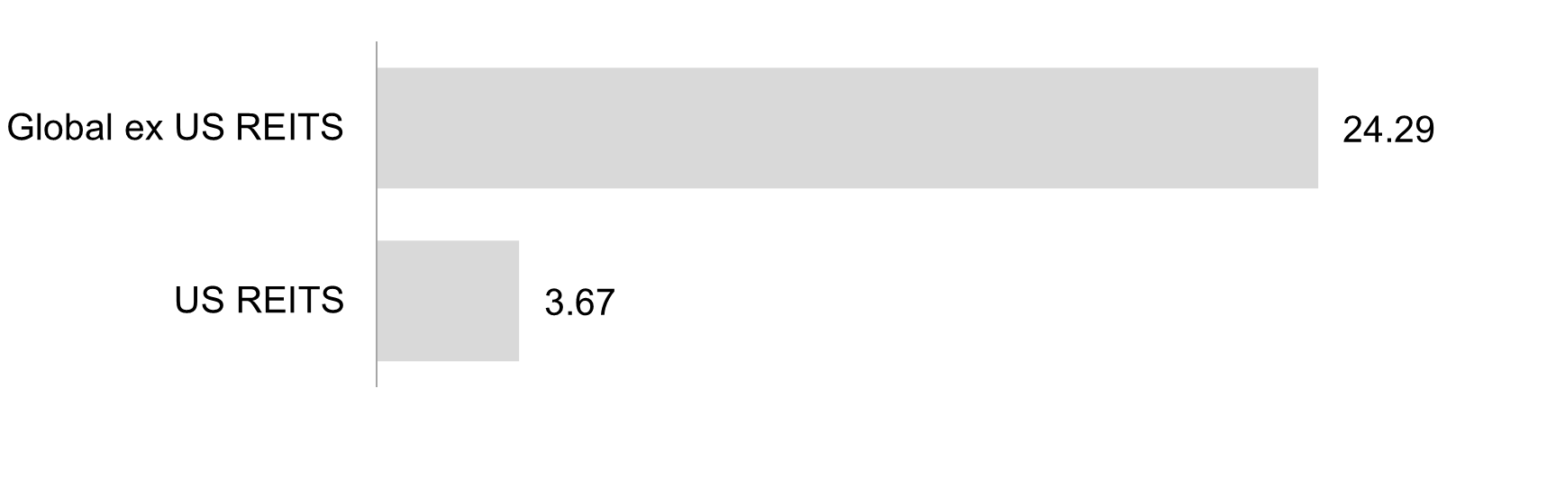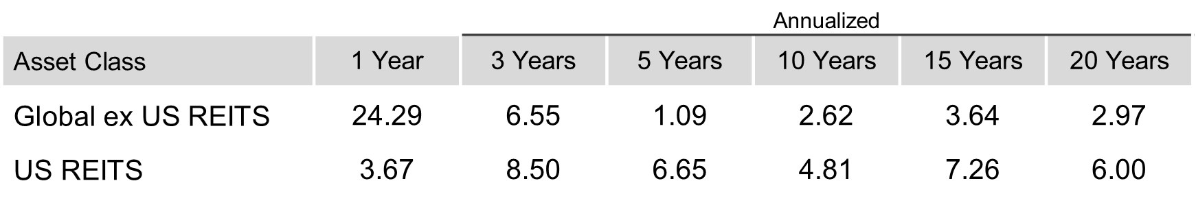 The Dow Jones US Select REIT Index rose 3.67%, while the S&P Global ex US REIT Index gained 24.29%.