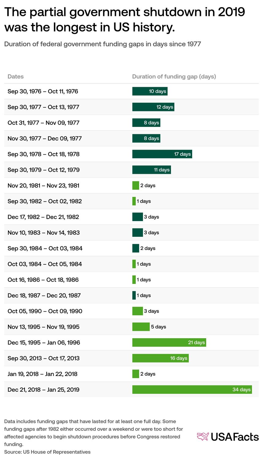 Since 1976, the U.S. has seen 20 funding gaps and 10 formal shutdowns. Most have been brief; a few have stretched into weeks.